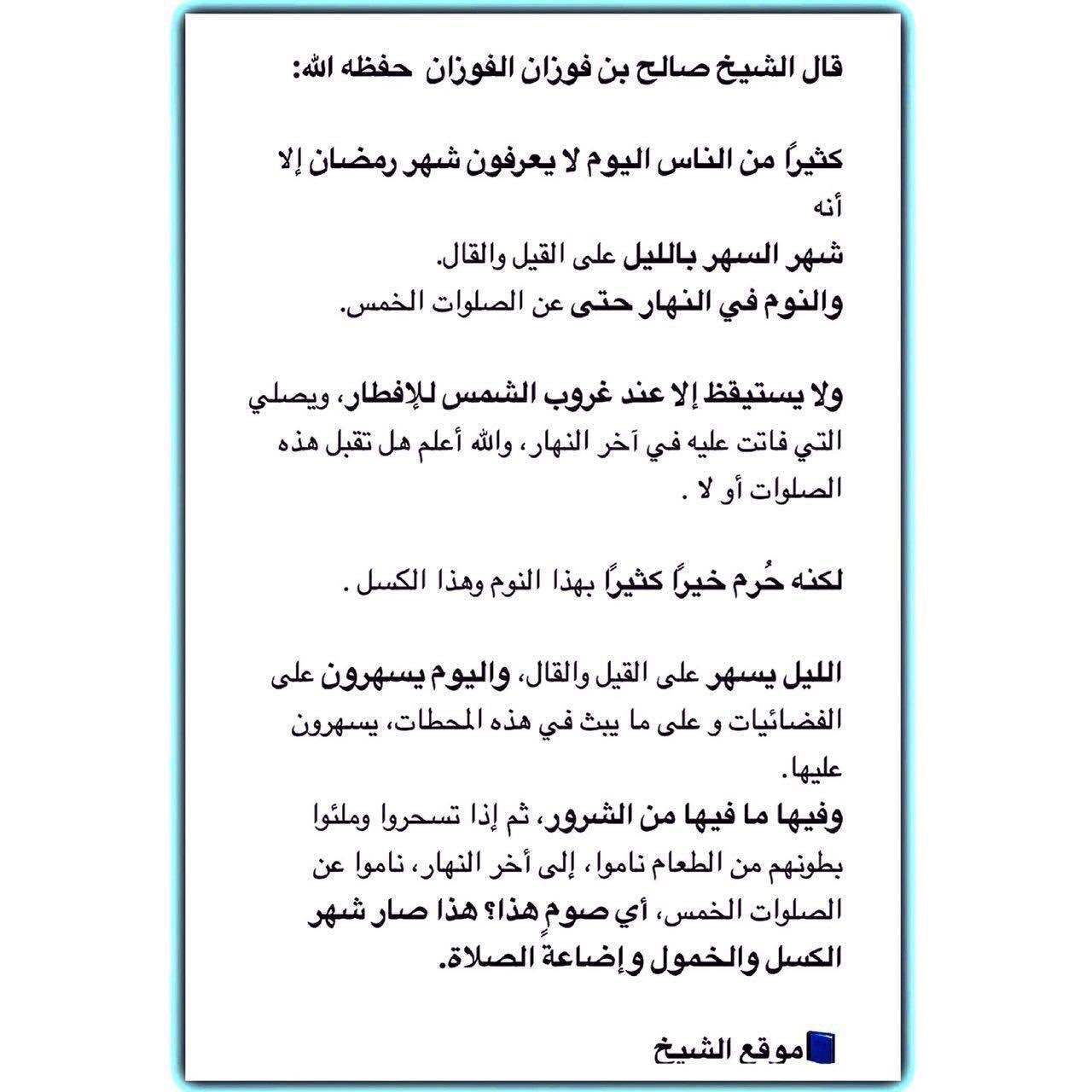 العلامة صالح الفوزان على تويتر قال الشيخ صالح بن فوزان الفوزان حفظه الله كثير ا من الناس اليوم لا يعرفون شهر رمضان إلا أنه شهر السهر بالليل على القيل والقال والنوم في النهار