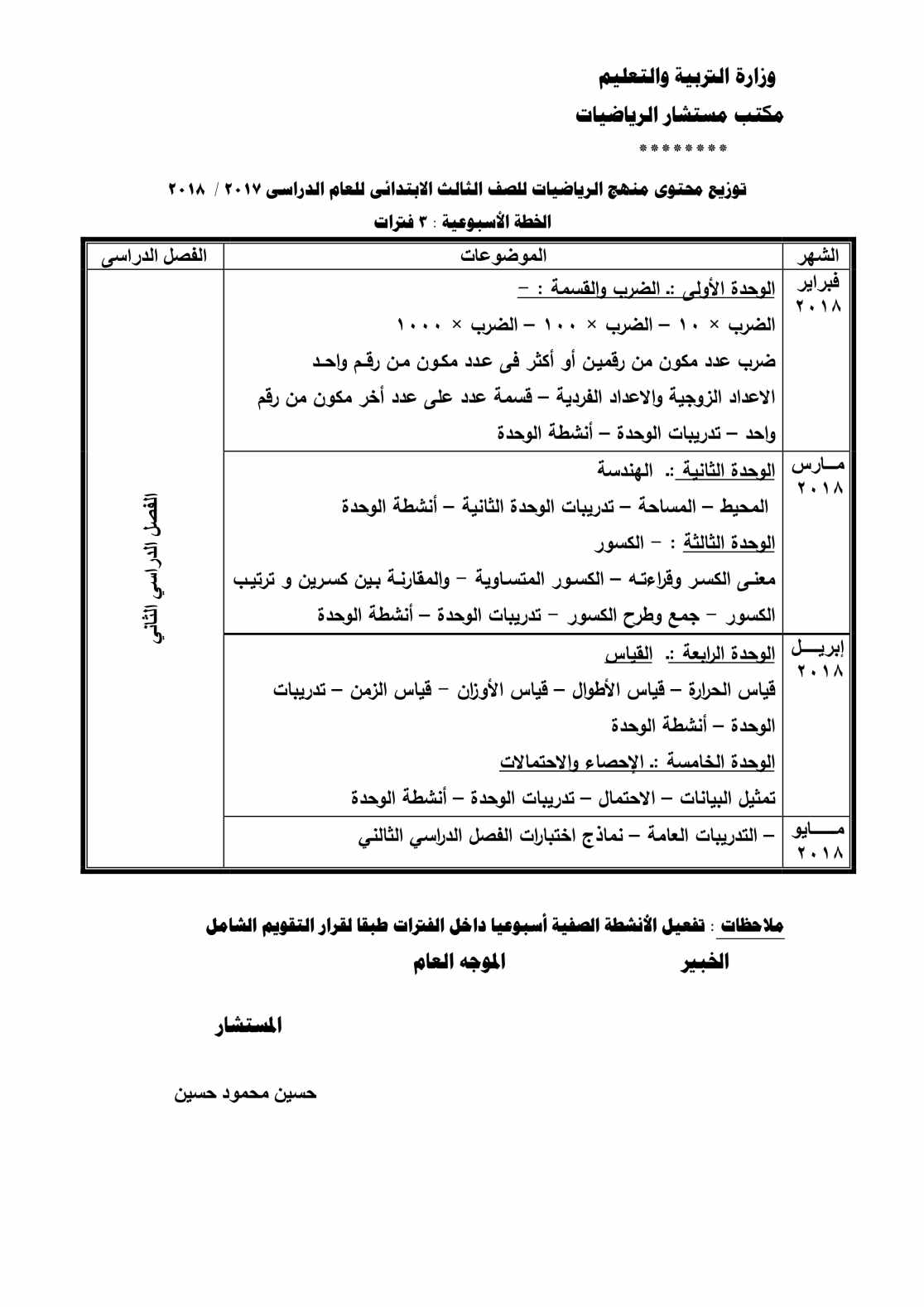 توزيع منهج رياضيات الصف الثالث الابتدائي الفصل الثاني