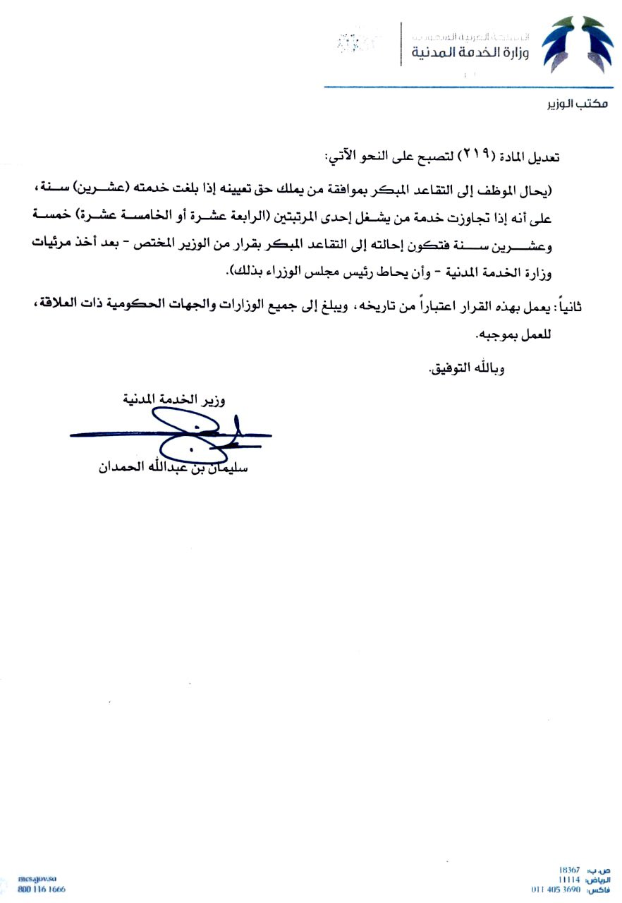 بوابة الموظفين نعود بحذر Twitterissa قرار وزير الخدمة المدنية رقم 414 وتاريخ 1441 02 25هـ بتعديل بعض مواد اللائحة التنفيذية للموارد البشرية في الخدمة المدنية تعديل المادة 212 بخصوص استقالة الموظف تعديل المادة 219 بخصوص